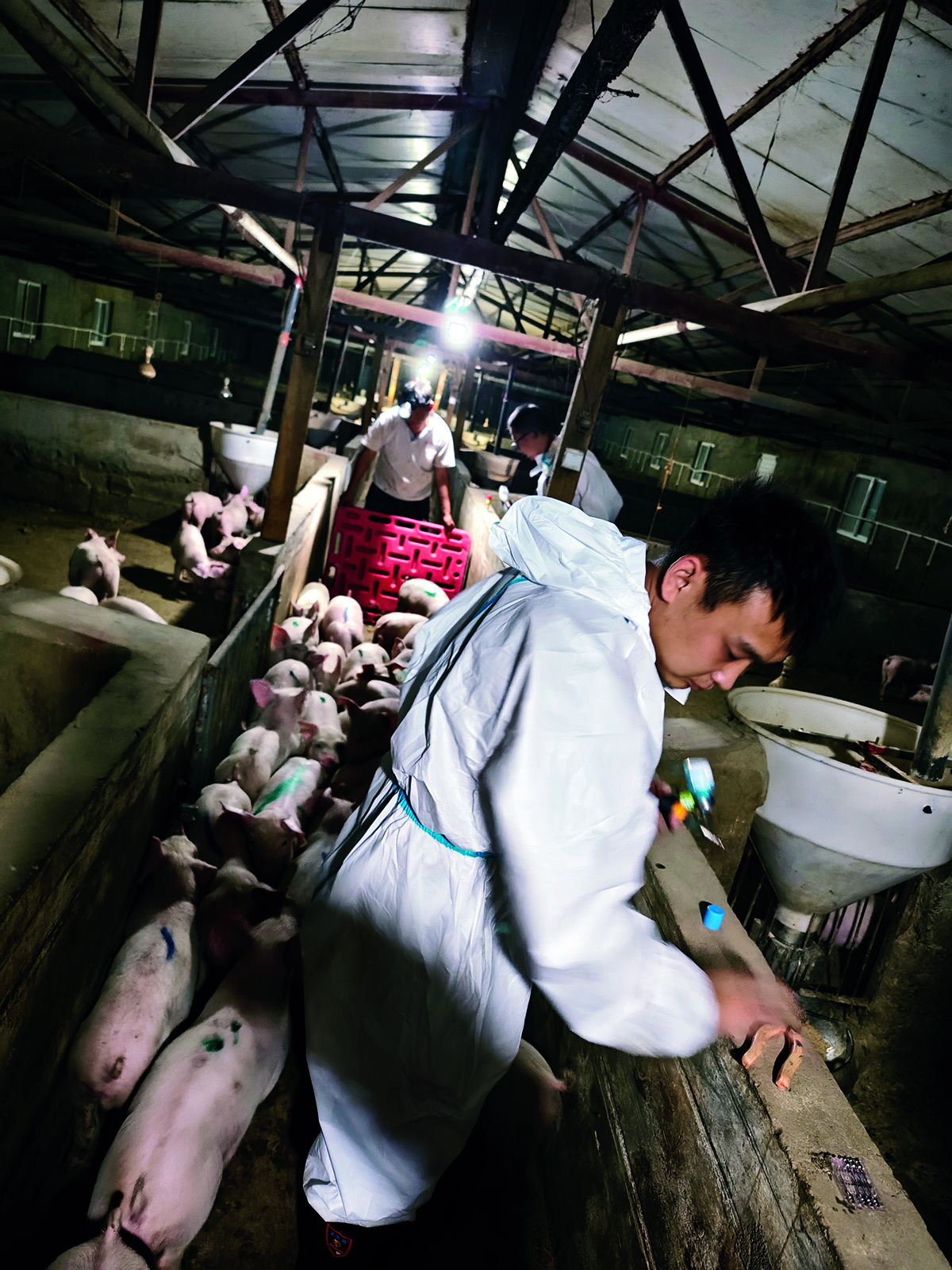 ▲张重阳为客户养殖场的猪只注射疫苗。