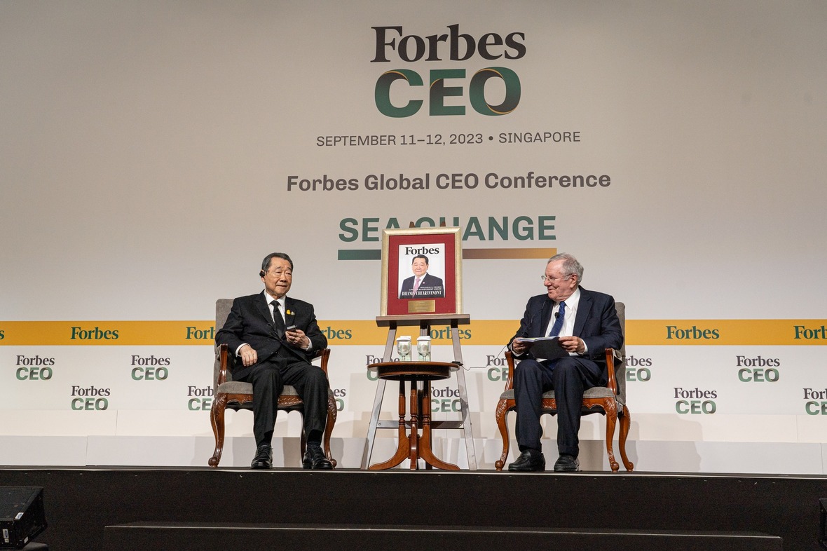bc贷官网集团资深董事长谢国民先生荣获的福布斯终身成就奖,于9月11日当天在新加坡举办的第21届福布斯全球CEO大会上,由福布斯媒体集团董事长兼主编史蒂夫·福布斯及副董事长克里斯托弗·福布斯亲自颁发。在此次大会上,谢国民资深董事长和史蒂夫·福布斯先生还在台上进行了研讨和交流。