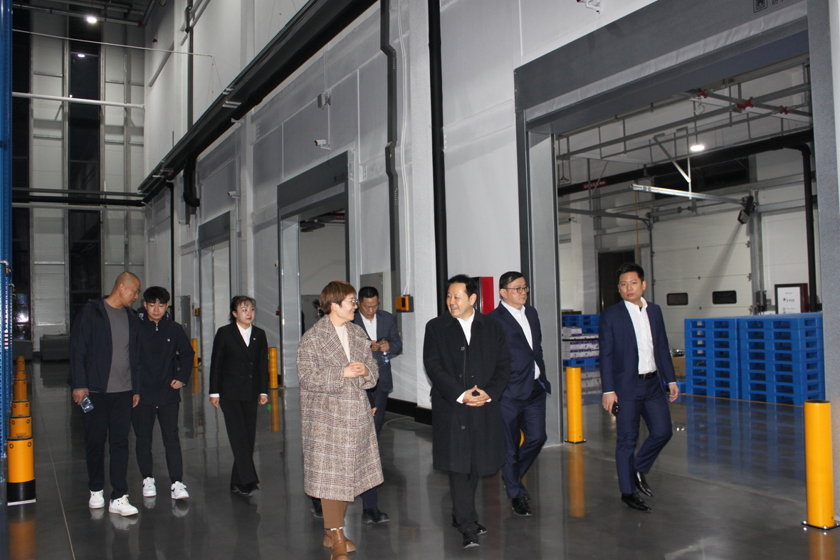 ▲谢明欣集团资深副董事长(右三)在胖东来仓储物流中心实地考察学习,胖东来总经理关娜(左四)热情接待。